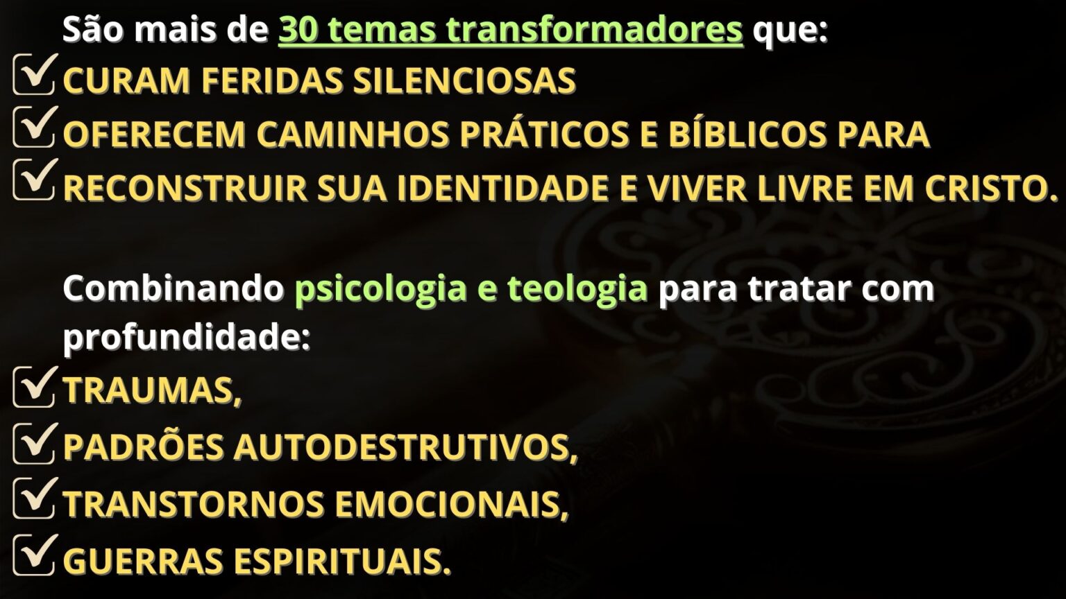 Baseado na Palavra de Deus e em princípios terapêuticos, este conteúdo oferece direção para transformar dor em maturidade, medo em confiança e escuridão em luz.